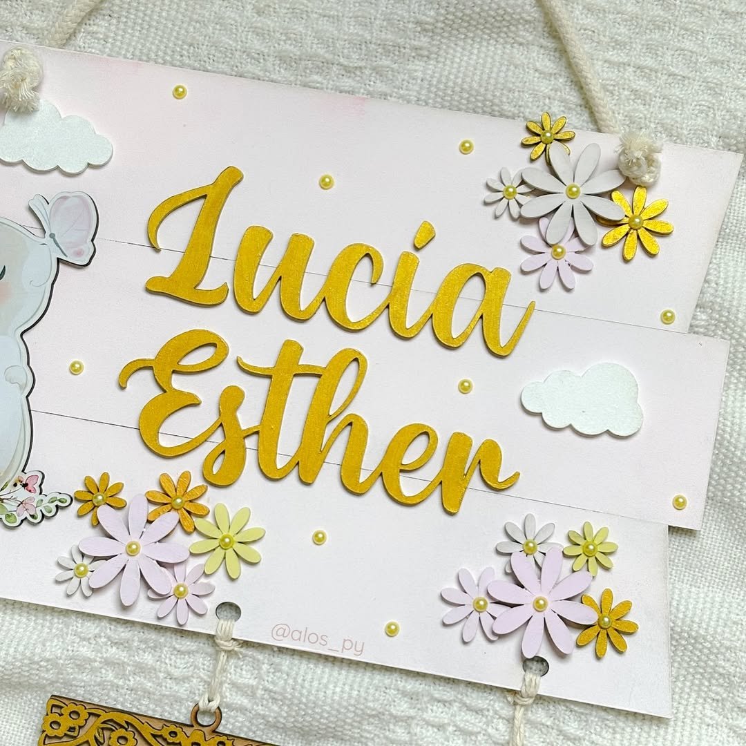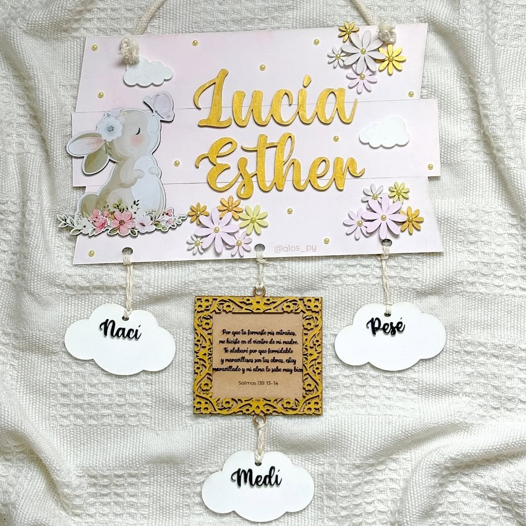Un diseño delicado y lleno de ternura para dar la bienvenida al bebé. Esta placa colgante en MDF está decorada con una conejita con flores, nubes y detalles dorados, junto al nombre en relieve. Incluye tres plaquitas en forma de nube para anotar (o grabar) los datos de nacimiento: nací, medí, pesé, y una plaquita central con un versículo bíblico grabado.