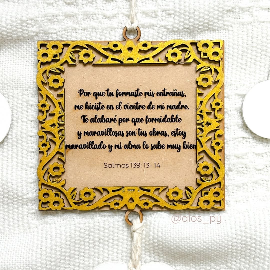 • 🧵 Incluye: cuerdita para colgar + 4 plaquitas inferiores (3 datos + 1 versículo).